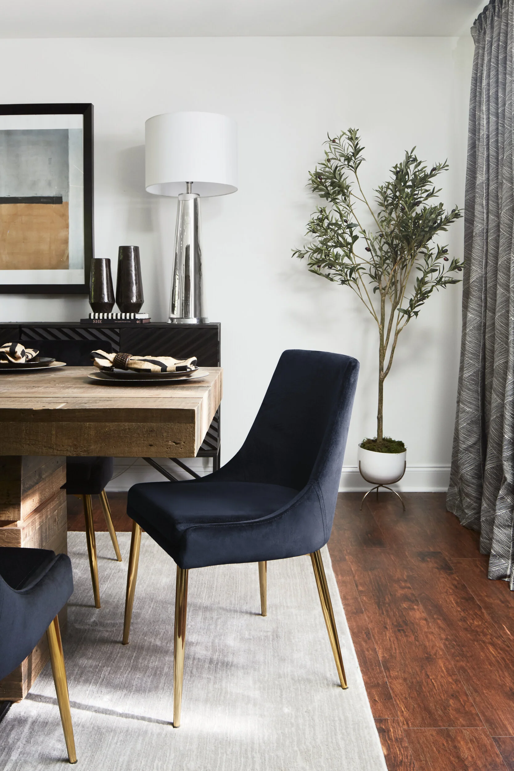 Featured products l KICHLER Eres light fixture l FOUR HANDS Tahoe Dining Table (bought on Craigslist) l Karina Velvet Dining Chair l UTTERMOST cabinet l SHERWIN WILLIAMS Wall Paint & Window Trim Paint